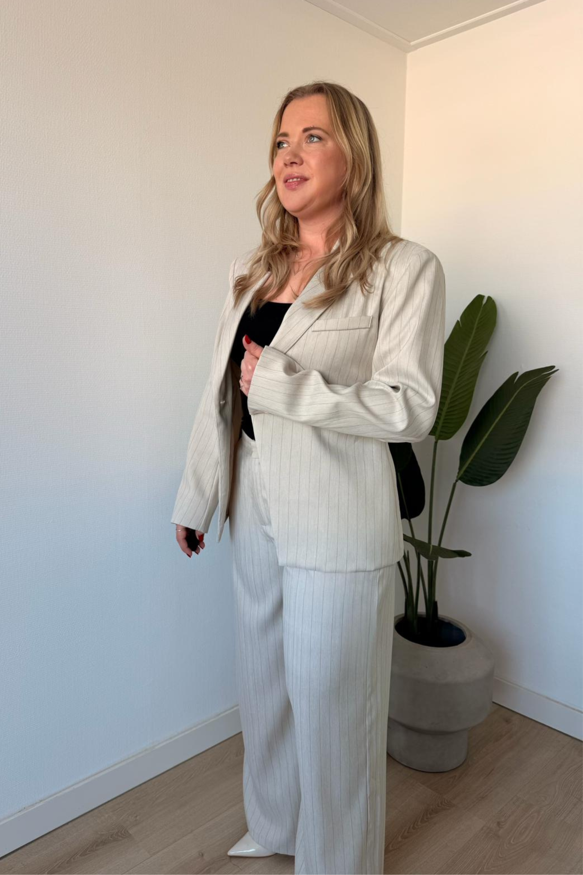 De Atelier Krijtstreep Blazer – Beige is elegant en een echte power suit van het merk ivivi. Het getailleerde silhouet accentueert de taille op een subtiele manier, terwijl de verfijnde krijtstreep zorgt voor een tijdloze, luxe uitstraling.