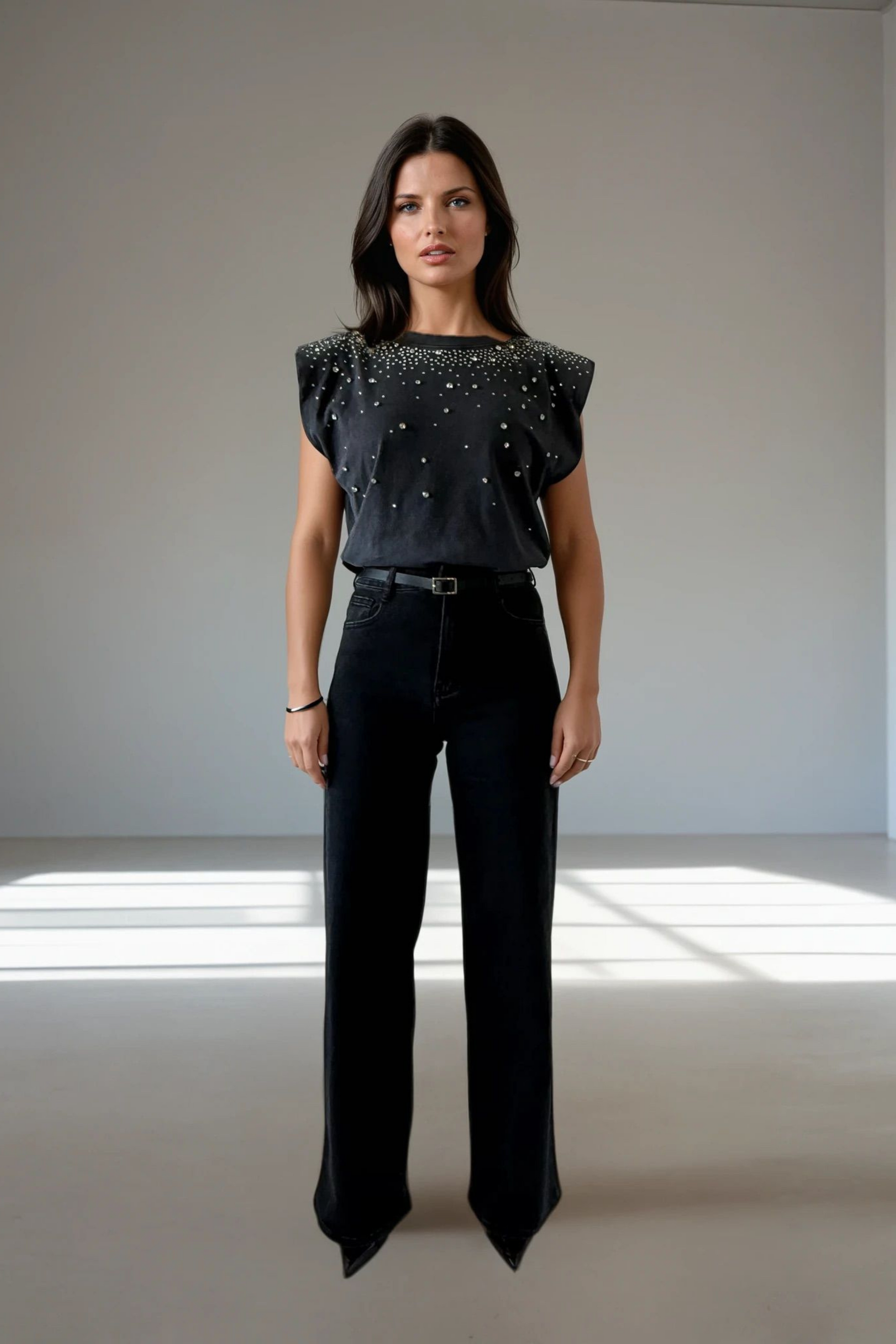 De Halo Tee is een echte blikvanger. Deze antracietkleurige top is versierd met zorgvuldig geplaatste glinsterende studs in verschillende formaten — zowel geplakt als gezet in klemmetjes — wat zorgt voor een luxe, sprankelende uitstraling. De top is gemaakt van een zachte katoenmix met lichte stretch en heeft een boxy fit met subtiele schoudervulling voor een krachtig silhouet. Perfect om te dragen naar een diner, feestje of om je casual outfit een upgrade te geven.