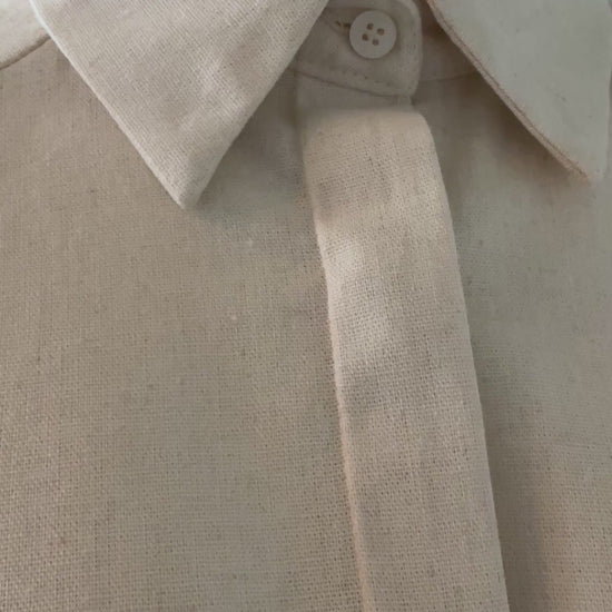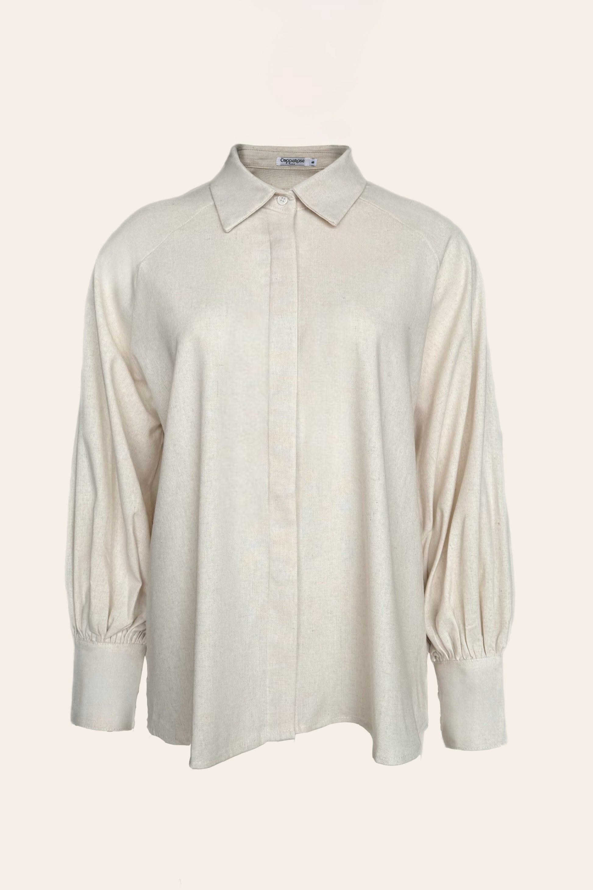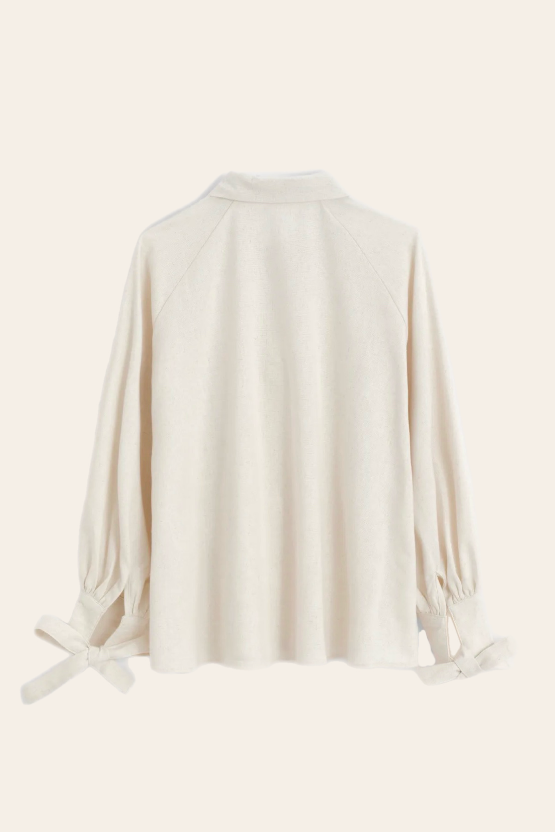 Deze stijlvolle linnen mix blouse is de perfecte toevoeging aan je garderobe voor het voorjaar. De blouse heeft een luchtige loose fit, een verfijnde verborgen knoopsluiting en elegante strikdetails op de mouwen die zorgen voor een vrouwelijke en speelse uitstraling.
