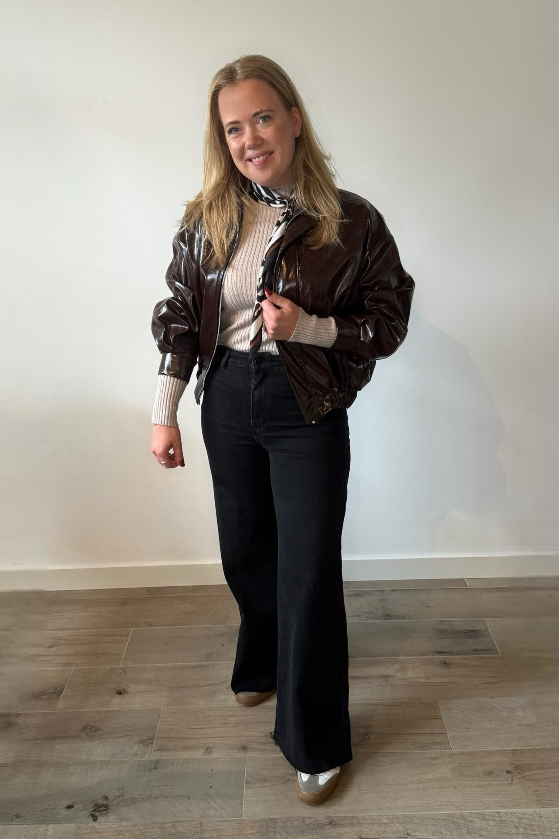 Anouk (172 cm) draagt maat 40. Ze combineert de Tone Jean met de Grace Top en het Lustre Jacket.