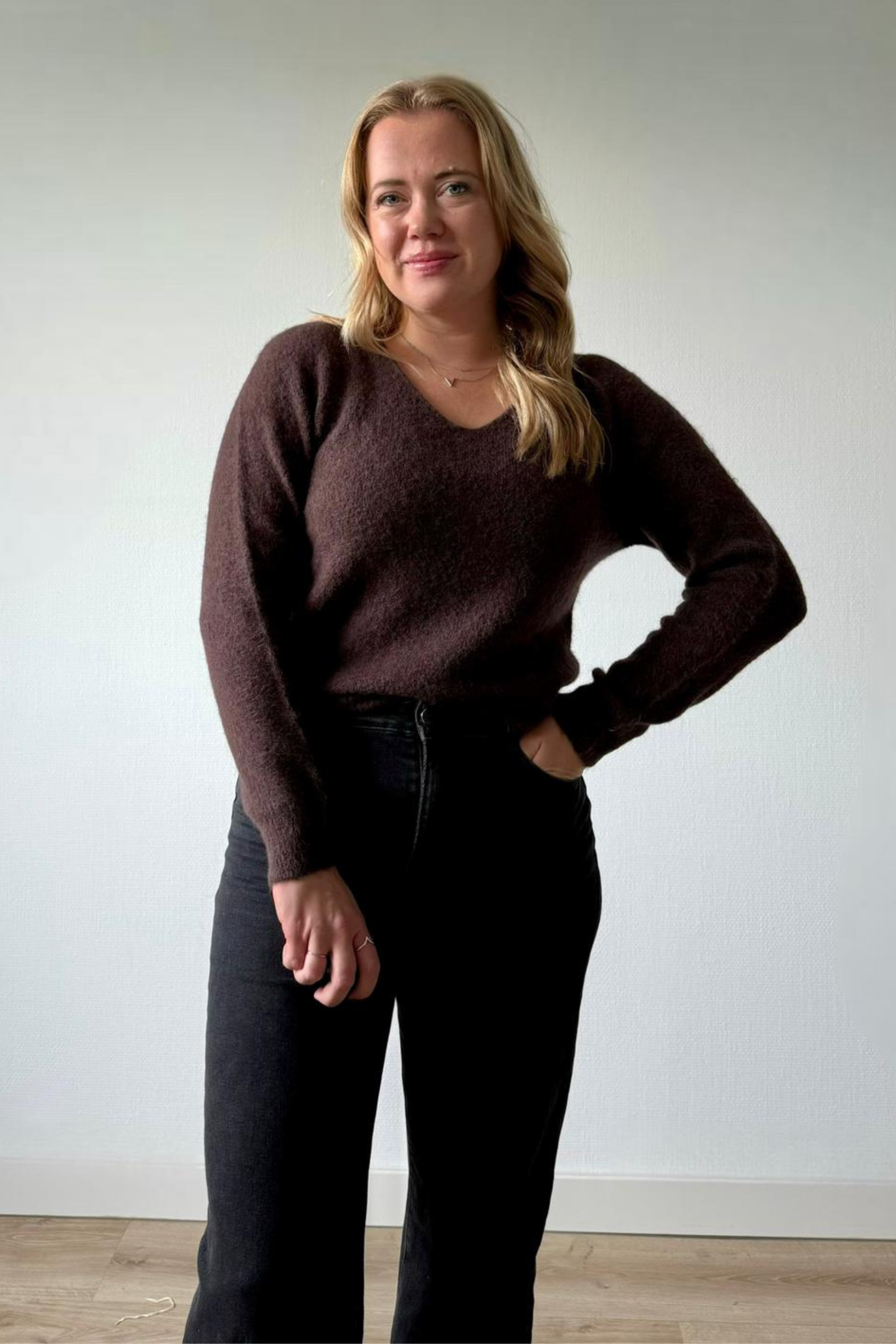 De subtiele textuur, lange mouwen en diepe V-hals creëren een flatterende, vrouwelijke pasvorm die zich moeiteloos aanpast aan elk moment van de dag — van ontspannen ochtenden thuis tot stijlvolle avonden uit.